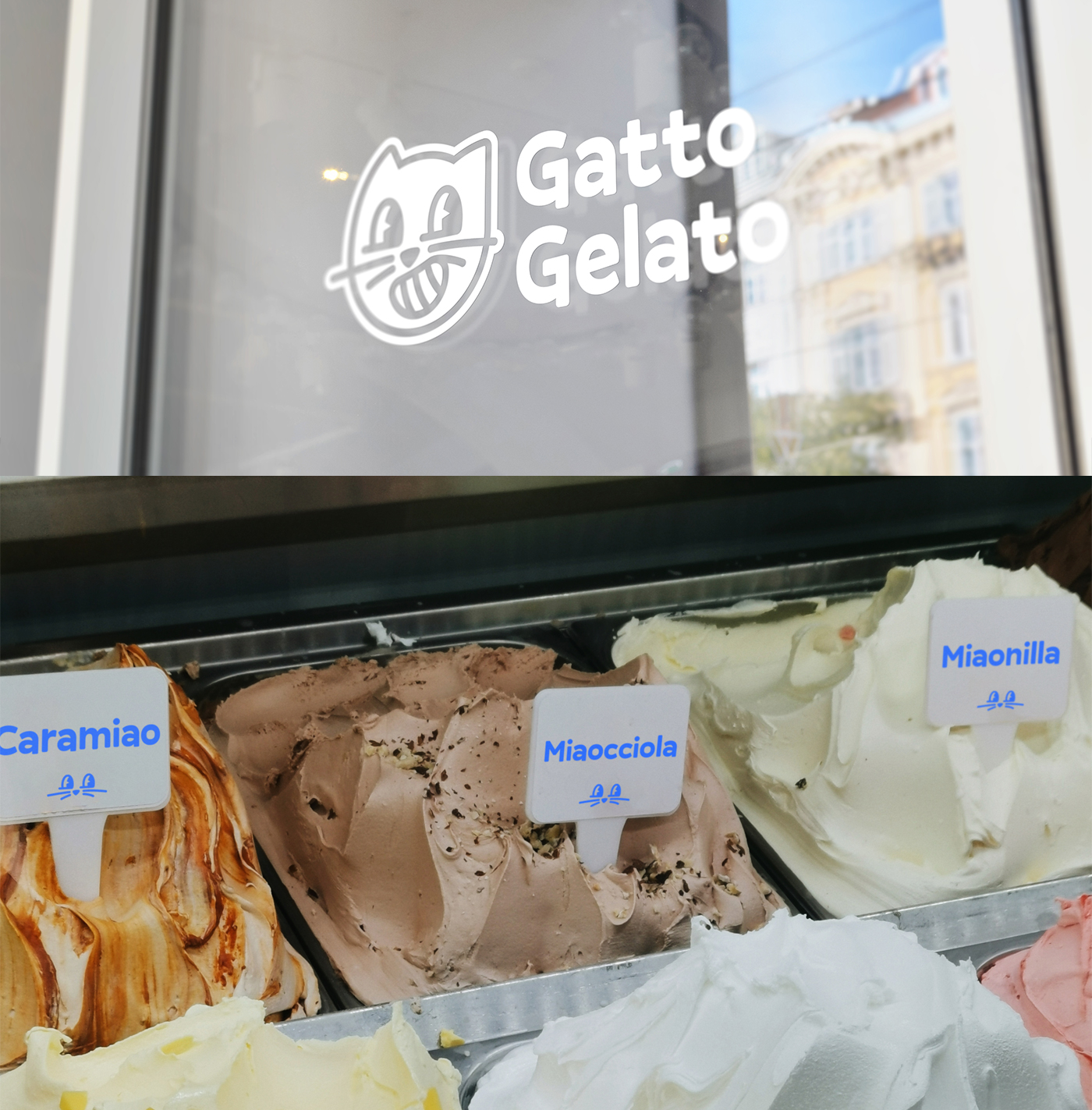 Branding für eine Eisdiele in dem idyllischen Dorf Cercemaggiore, Italien. Das Maskottchen ist eine verspielte Katze im Stil der frühen 1900er Cartoons. Daher war es auch wichtig, viele Katzenelemente über das ganze Branding zu verteilen! Katzenpfoten als Motiv bei Stempelkarten oder die Namen der Eissorten wie Miaongo statt Mango.